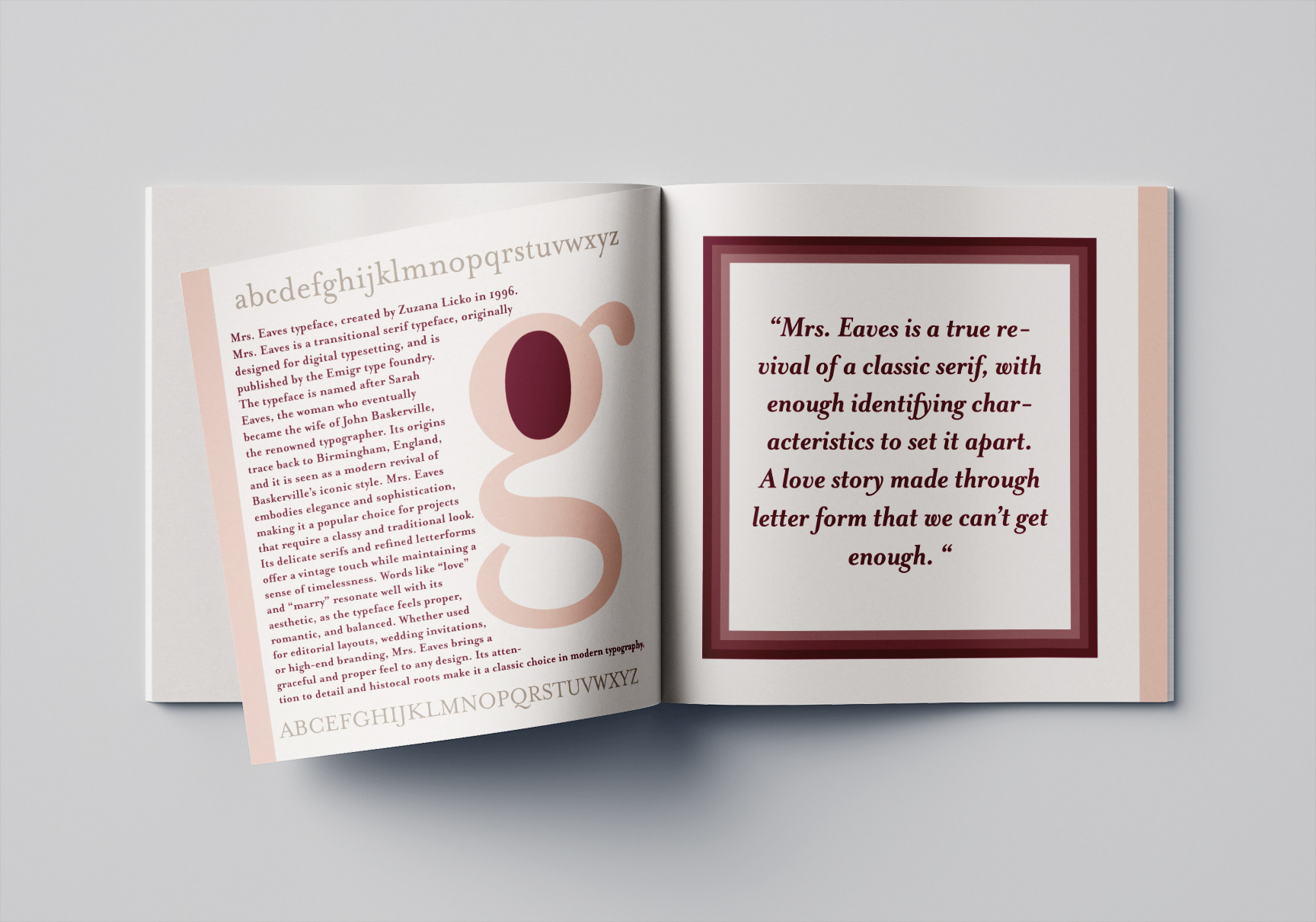 We were tasked with choosing a typeface and designing a brochure that showcased its history, personality, and design potential. I chose Mrs. Eaves — a serif with a rich and dramatic backstory that made the design process all the more exciting. I leaned into its classic elegance while experimenting with bold layouts and typographic contrast.